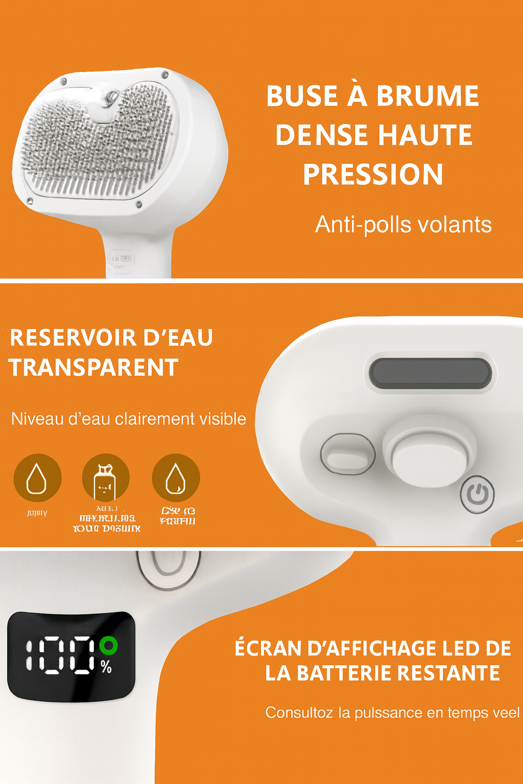 Grâce à son réservoir intégré, elle diffuse une fine brume d’eau qui assouplit le poil et rend le brossage plus agréable. Le geste devient simple et intuitif : il suffit d’appuyer sur le bouton pour libérer la vapeur et laisser la brosse glisser sur le pelage.